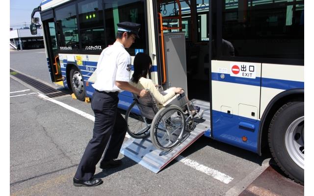 平成29年3月に、より多くのお客さまに楽に乗車していただけるよう、全車両がノンステップバスとなりました。ノンステップバスは、出入口に階段がなく、車両中央部に2台分の車いすスペースを設けています。乗降時の車高調整装置を搭載しているほか、車いすやベビーカーをご利用のお客さまがそのままご乗車いただけるよう、スロープ板を備えています。