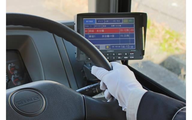 安全かつ適正に市バスを運行するため、画像や音声により運転士をサポートする「運行支援システム」を平成28年4月1日に全車両へ導入しました。このシステムは、運行経路の間違えやすい場所などで、正しい進行方向を知らせる「進路指示機能」や、バス停で所定の発車時刻より早く発車しようとしたときなどに注意喚起する「遅早発防止機能」を備えています。