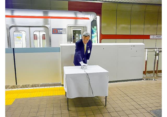 中村区役所駅で行ったホーム柵使用開始式でスイッチを押す様子